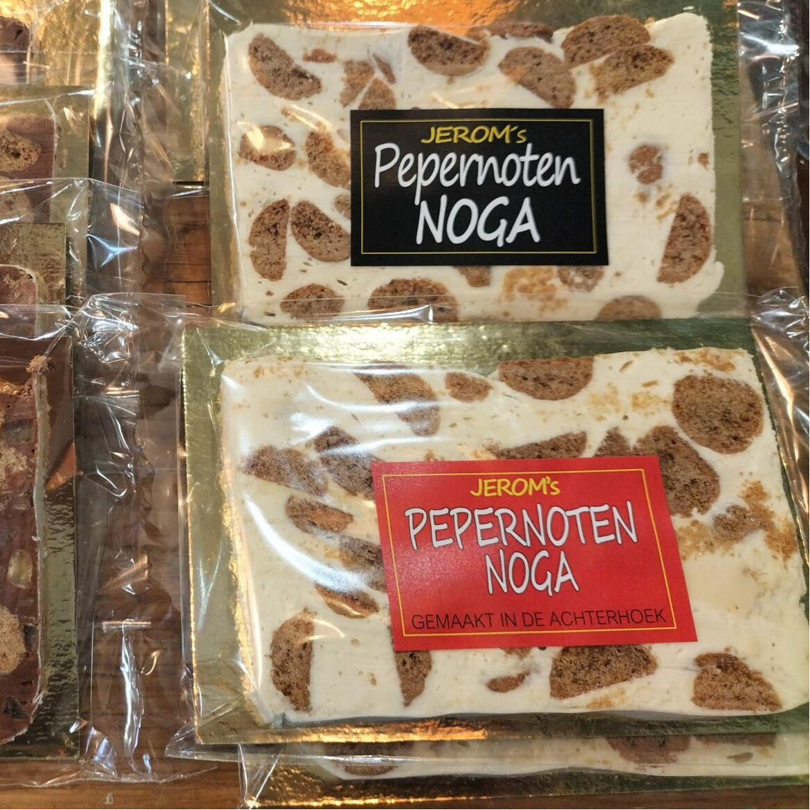 Ingrediënten: eiwit, suiker en honing uit de streek. Maar deze noga is met gewone noten, maar pepernoten vervaardigd. Al jaren een heerlijke noga om te schenken!